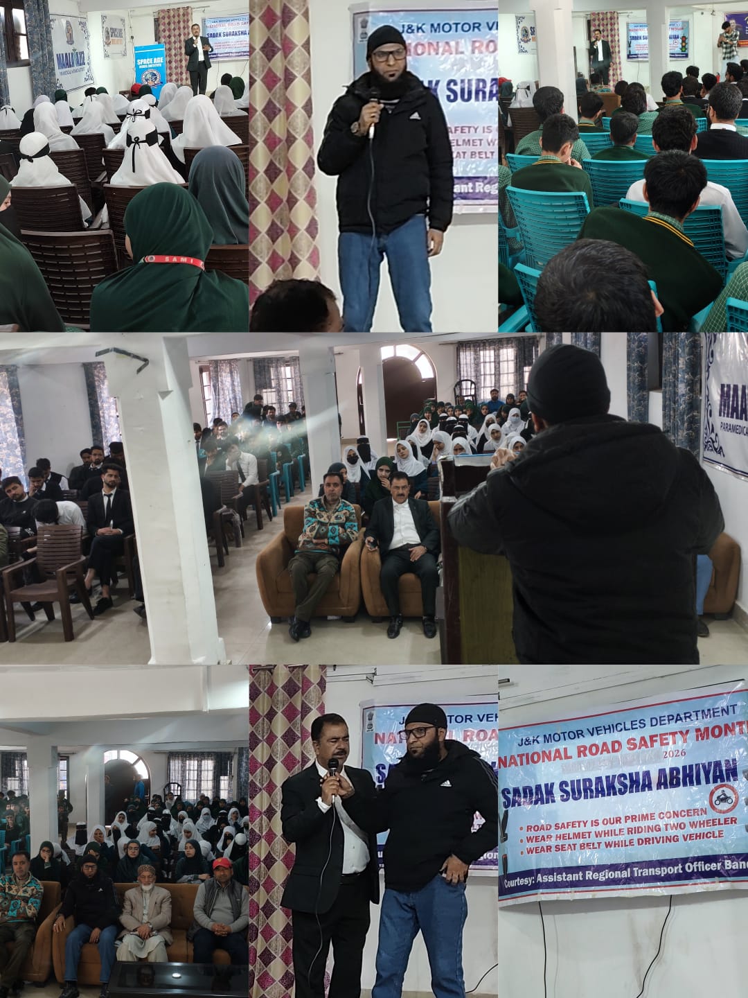 Bandipora, April 01: The office of the Assistant Regional Transport Officer (ARTO) Bandipora on Tuesday organised a road safety awareness camp at Space Age Higher Secondary School as part of activities under National Road Safety Month 2026.