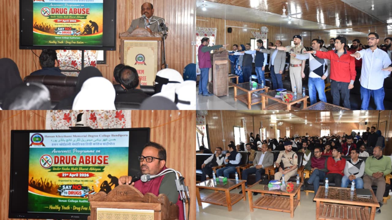 Bandipora, April 21: An awareness programme on drug abuse was organised today at the HKM College Auditorium in Bandipora under the aegis of NCORD Cell and NSS Units as part of the ongoing Nasha Mukt Bharat Abhiyaan (NMBA).
