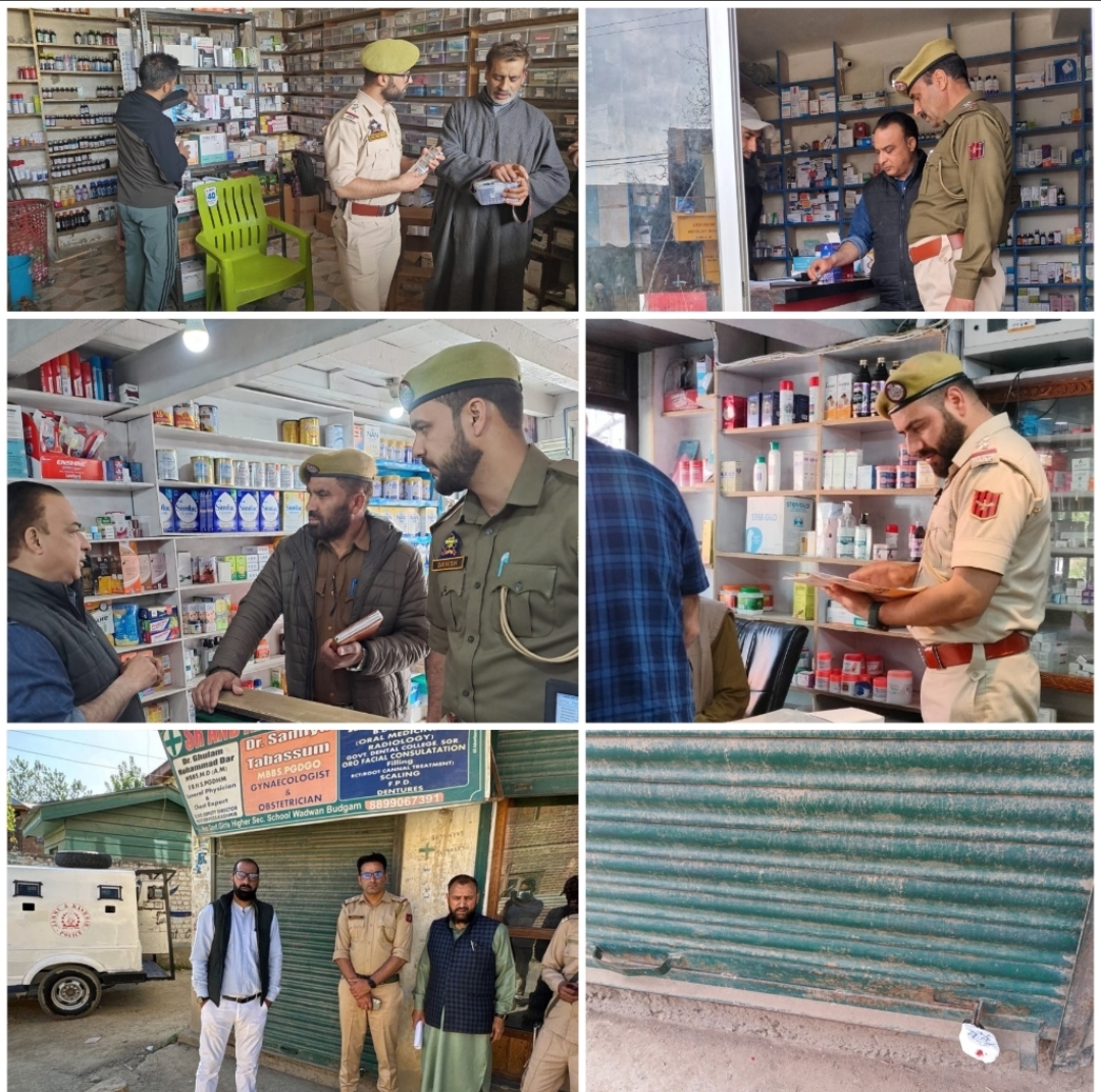 Budgam, April 23: As part of the ongoing Nasha Mukt Jammu & Kashmir Abhiyan, Budgam Police carried out a comprehensive inspection drive of medical shops across various locations in District Budgam to ensure strict adherence to government regulations and prevent the misuse of pharmaceutical drugs.