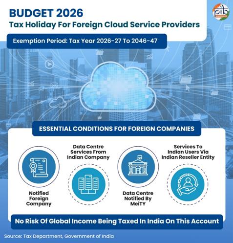 The Union Budget 2026–27 introduces a major policy initiative to strengthen India’s position as a global hub for digital infrastructure. Recognizing the central role of cloud computing, AI data centres and advanced electronics in economic growth, the Government has announced a tax holiday till 2047 for eligible foreign cloud service providers operating through India-based data centre infrastructure.