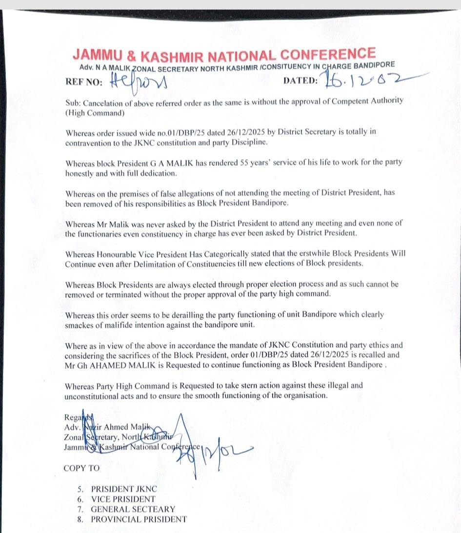 BANDIPORA, DEC 26 ; A serious internal rift has surfaced within the Bandipora unit of the Jammu and Kashmir National Conference (JKNC), marked by a series of contradictory official orders that point to deepening factionalism and procedural disarray.