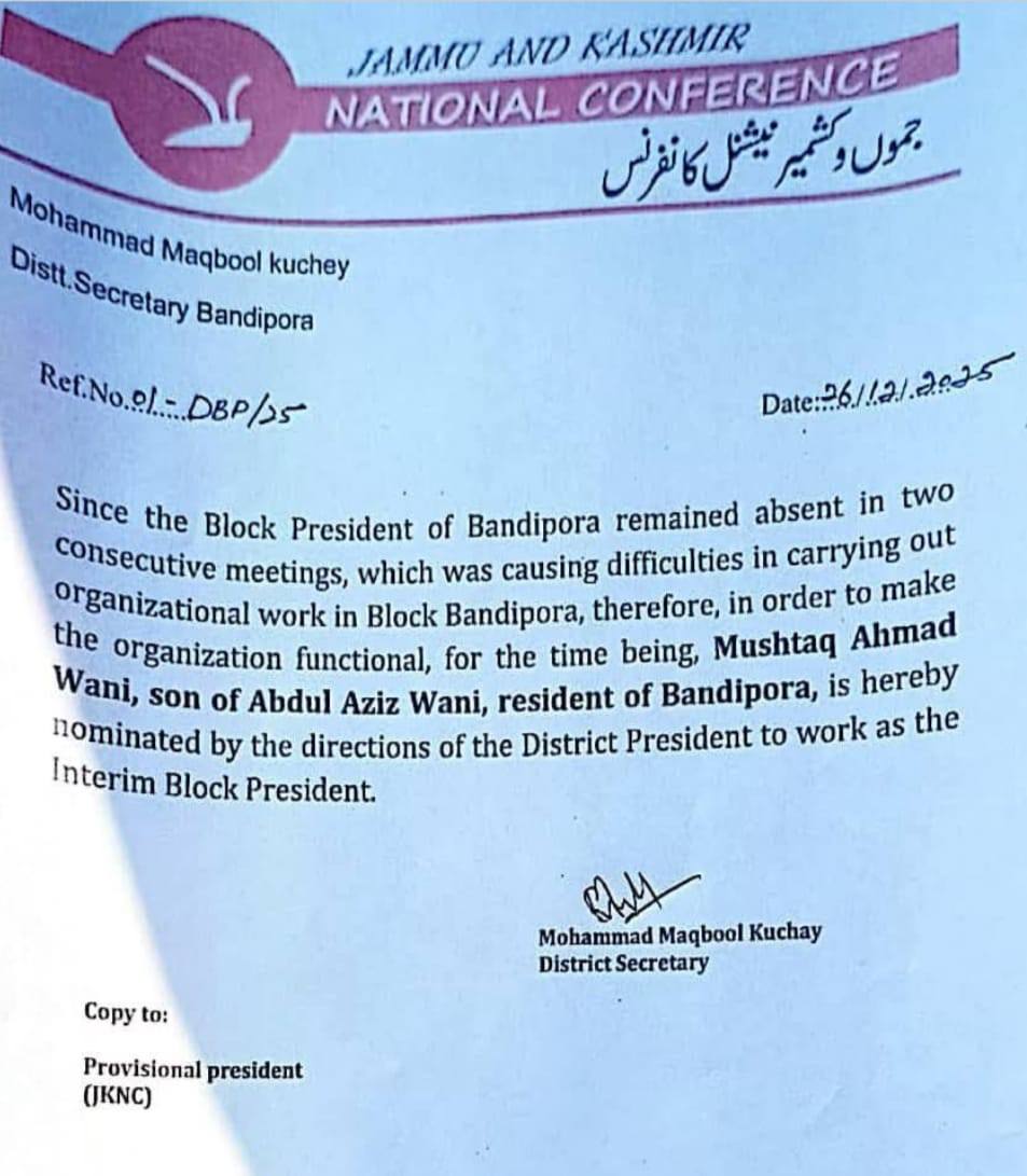 The sequence began with an order (No. 01/DBP/25 dated 26/12/2025) issued by District Secretary Mohammad Maqbool Kuchay. Citing the absence of the Block President from two consecutive meetings, which allegedly hampered organizational work, the order nominated Mushtaq Ahmad Wani as the Interim Block President of Bandipora “by the directions of the District President.”