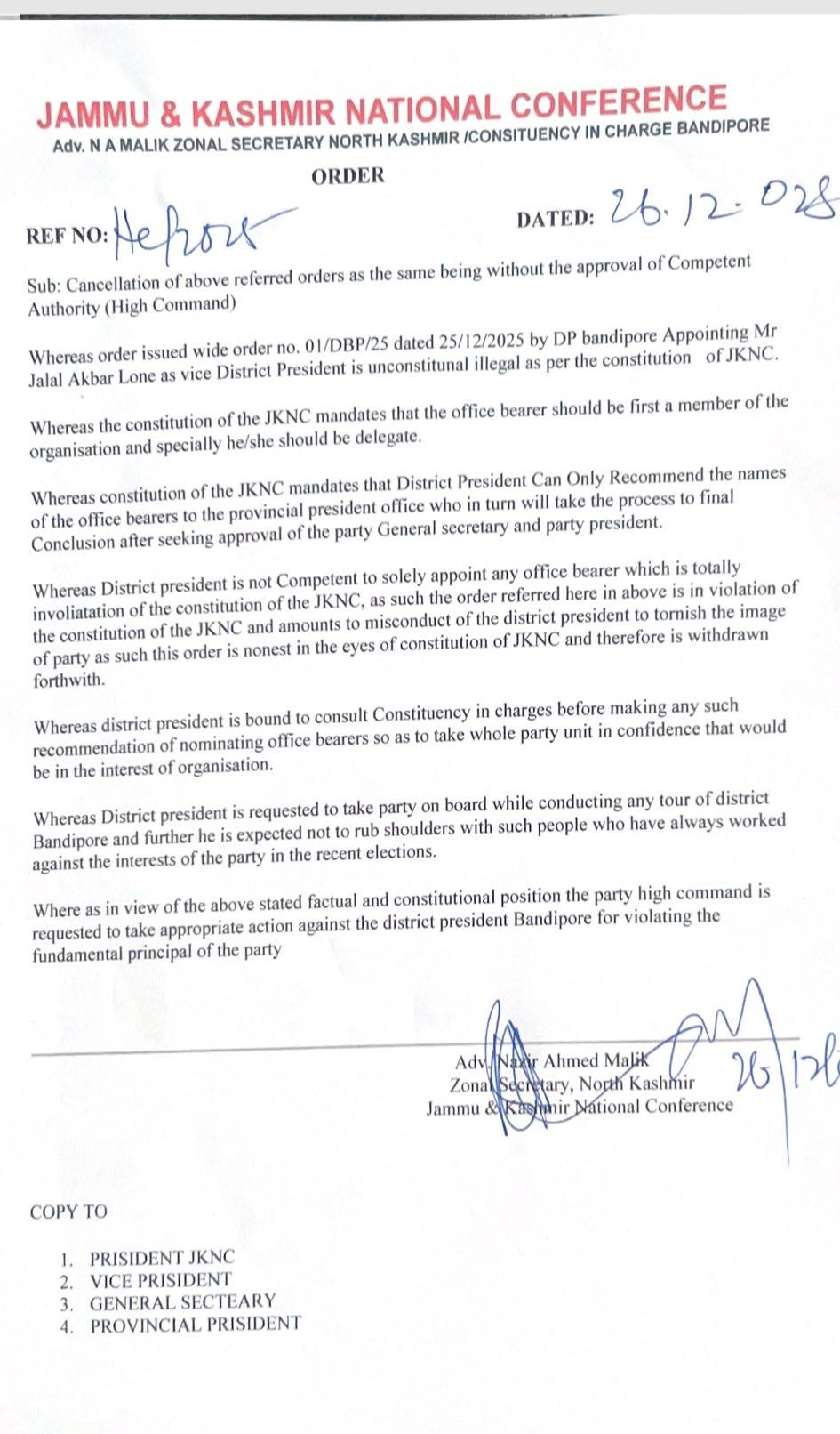 However, within hours, a counter-order was issued by Advocate Nazir Ahmed Malik, the Zonal Secretary for North Kashmir. This order declared the earlier appointment “without the approval of the Competent Authority (High Command)” and “totally in contravention of the JKNC constitution and party discipline.”
