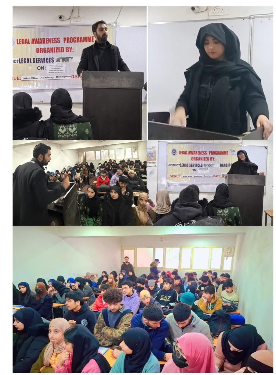 Advocate Iqbal Rubbani and Advocate Toiba Tabasum, Deputy LADC Bandipora, served as resource persons and interacted extensively with the students, addressing their queries and elaborating on laws related to drug abuse and allied offences along with their legal implications. The management and staff of Mindwire Educational Academy extended full cooperation and provided necessary logistical support, while the programme witnessed active participation from students and teachers, making the session impactful and engaging. The event concluded with an appeal to the youth to stay away from drugs and contribute towards building a healthy, responsible and drug-free society.