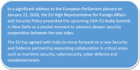 Security and defence cooperation has become an increasingly important pillar of India-EU engagement. The February 2025 Leaders’ Statement during the College of Commissioners’ visit highlighted plans to explore a Security and Defence Partnership, signaling convergence in addressing regional and global security challenges. The December 2025 delegation from the Society of Indian Defence Manufacturers to Brussels strengthened industrial collaboration, while the EU Political and Security Committee—representing all 27 EU member states—conducted its first-ever visit to Asia, holding high-level discussions in India with the Foreign Secretary, Deputy NSA, and Secretary (West).