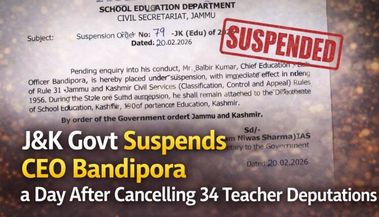 Srinagar, Feb 20: Jammu & Kashmir Government on Thursday suspended Chief Education Officer (CEO) Bandipora, Balbir Kumar, barely a day after he cancelled the deputation of 34 teachers originally posted in Education Zone Gurez but had been deputed in other zones without formal approval.