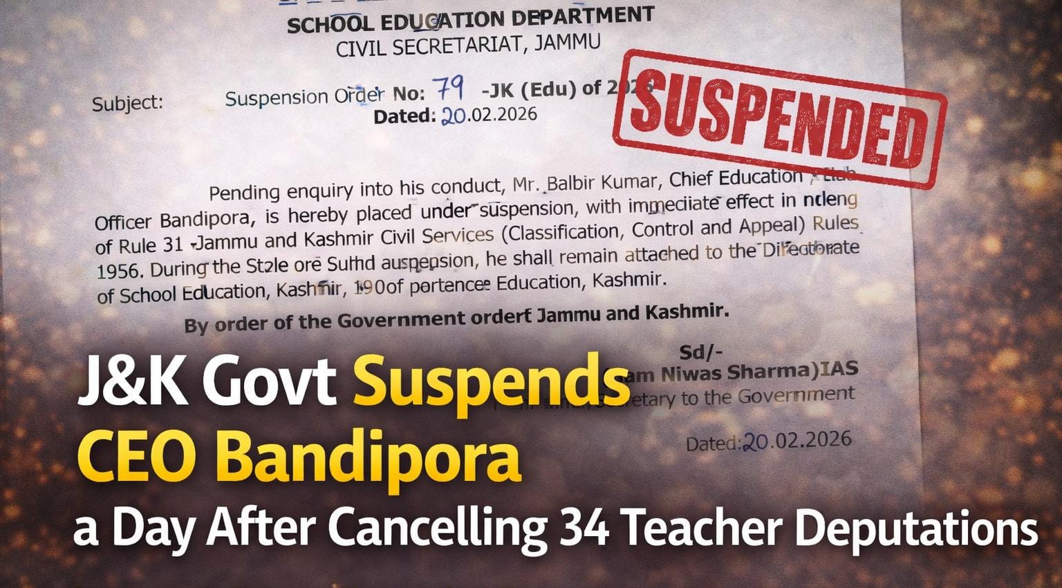 According to Government Order No. 79-JK (Edu) of 2026 dated February 20, 2026, issued by the School Education Department, Kumar has been placed under suspension with immediate effect pending enquiry into his conduct under Rule 31 of the Jammu and Kashmir Civil Services (Classification, Control and Appeal) Rules, 1956.