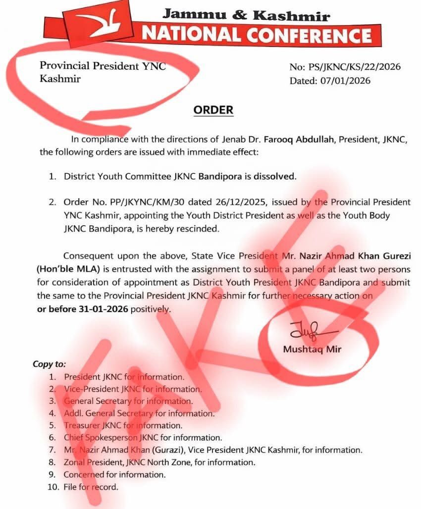 In a statement issued to Kashmir Convener, Danish Shafi, District President of JKNC Youth Bandipora, said the original order issued by the Provincial Secretary JKNC Kashmir remains valid, and no changes have been made to the Youth Body as falsely claimed online.