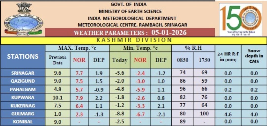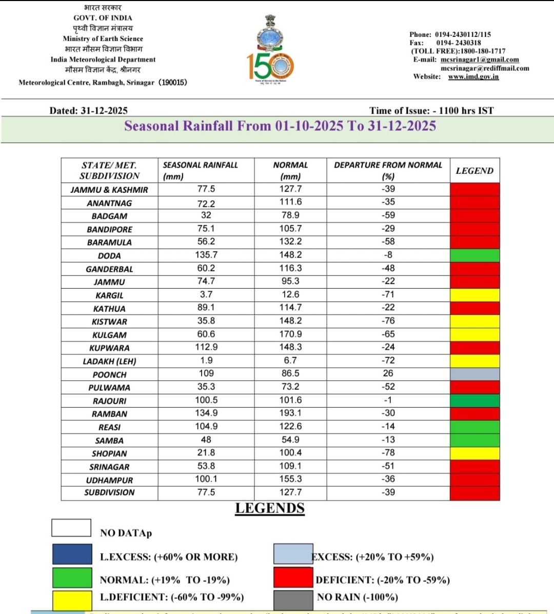 However, the current winter has raised serious alarming bells. According to data released by the Meteorological Centre, Srinagar, Jammu and Kashmir recorded a 39 percent precipitation deficit during the period from October 1 to December 31, 2025, with Anantnag, Budgam, Bandipora, Baramulla and Srinagar receiving only 72.2 mm, 32 mm, 75.1 mm, 56.2 mm and 53.8 mm precipitation against a normal of 116.6 mm, 78.9 mm, 105.7 mm, 132.2 mm and 109.1 mm respectively. Several districts, including Srinagar, Baramulla, Budgam and Shopian, have experienced large scale precipitation deficit. Adding to the concern, snowfall depth recorded so far is far below that of previous years. As per data available with the Meteorological Centre Srinagar, Gulmarg has recorded just 4.0 cm of snowfall, while Pahalgam has recorded a mere 0.2 cm. Other locations including Srinagar, Qazigund, Kokernag, Konibal and Kupwara have recorded 0 cm snowfall as on January 5, 2026.