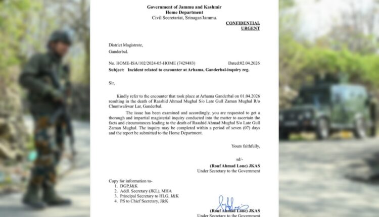 Srinagar, Apr 03: Lieutenant Governor Manoj Sinha on Friday ordered a magisterial inquiry into the encounter killing allegedly a man in Arhama village of Ganderbal district, following allegations from the family that the deceased was an innocent civilian.