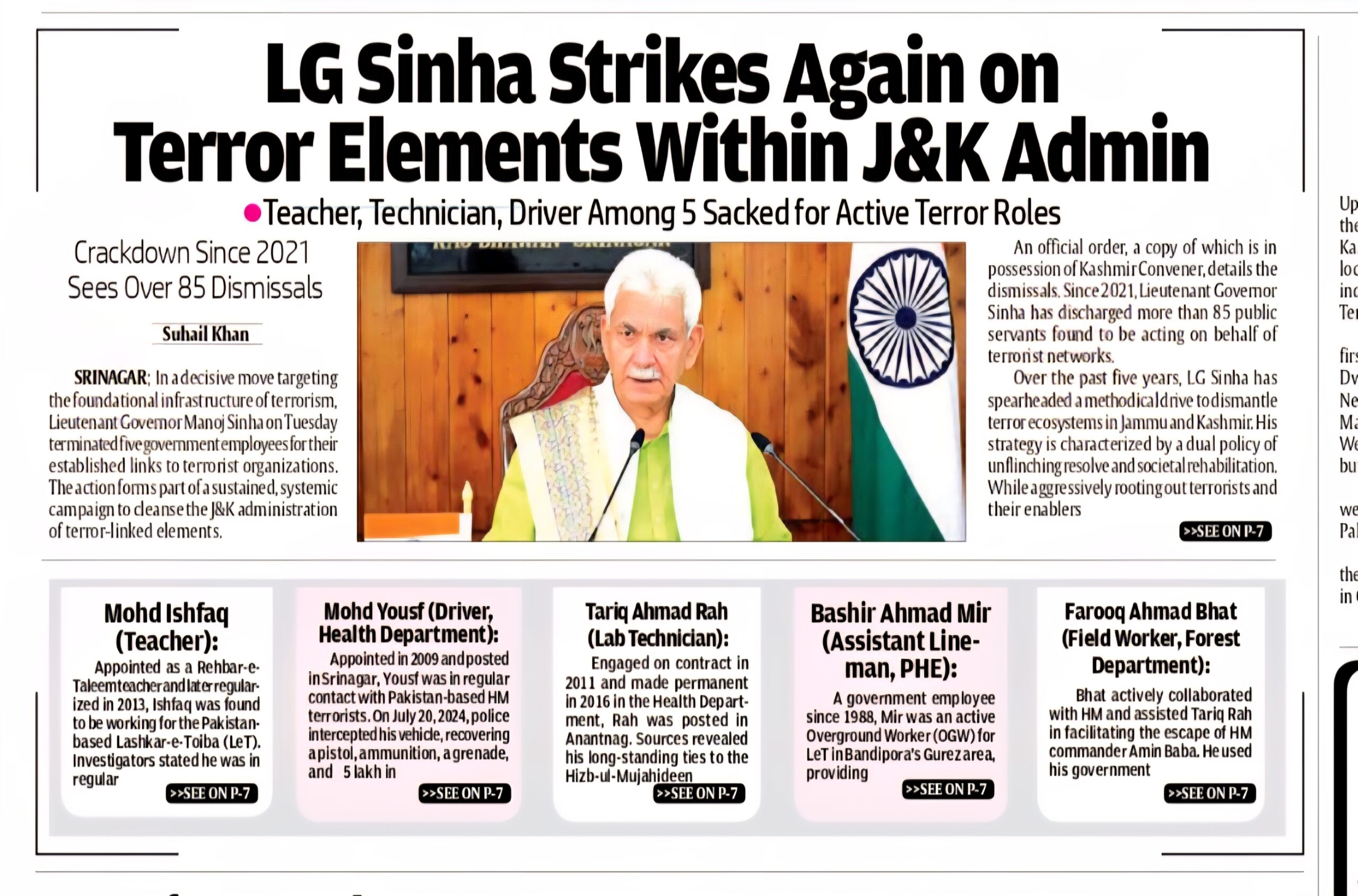 Srinagar, Jan 13: In a decisive move targeting the foundational infrastructure of terrorism, Lieutenant Governor Manoj Sinha on Tuesday terminated five government employees for their established links to terrorist organizations. The action forms part of a sustained, systemic campaign to cleanse the J&K administration of terror-linked elements.