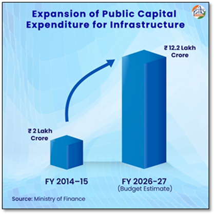 To reinforce infrastructure creation, public capital expenditure has increased substantially in recent years. The Government capital outlay has grown from ₹2 lakh crore in FY2014–15 to a Budget Estimate of ₹12.2 lakh crore in 2026–27. This sustained increase has strengthened the physical backbone required for large manufacturing ecosystems, including industrial parks, logistics infrastructure, and freight connectivity.