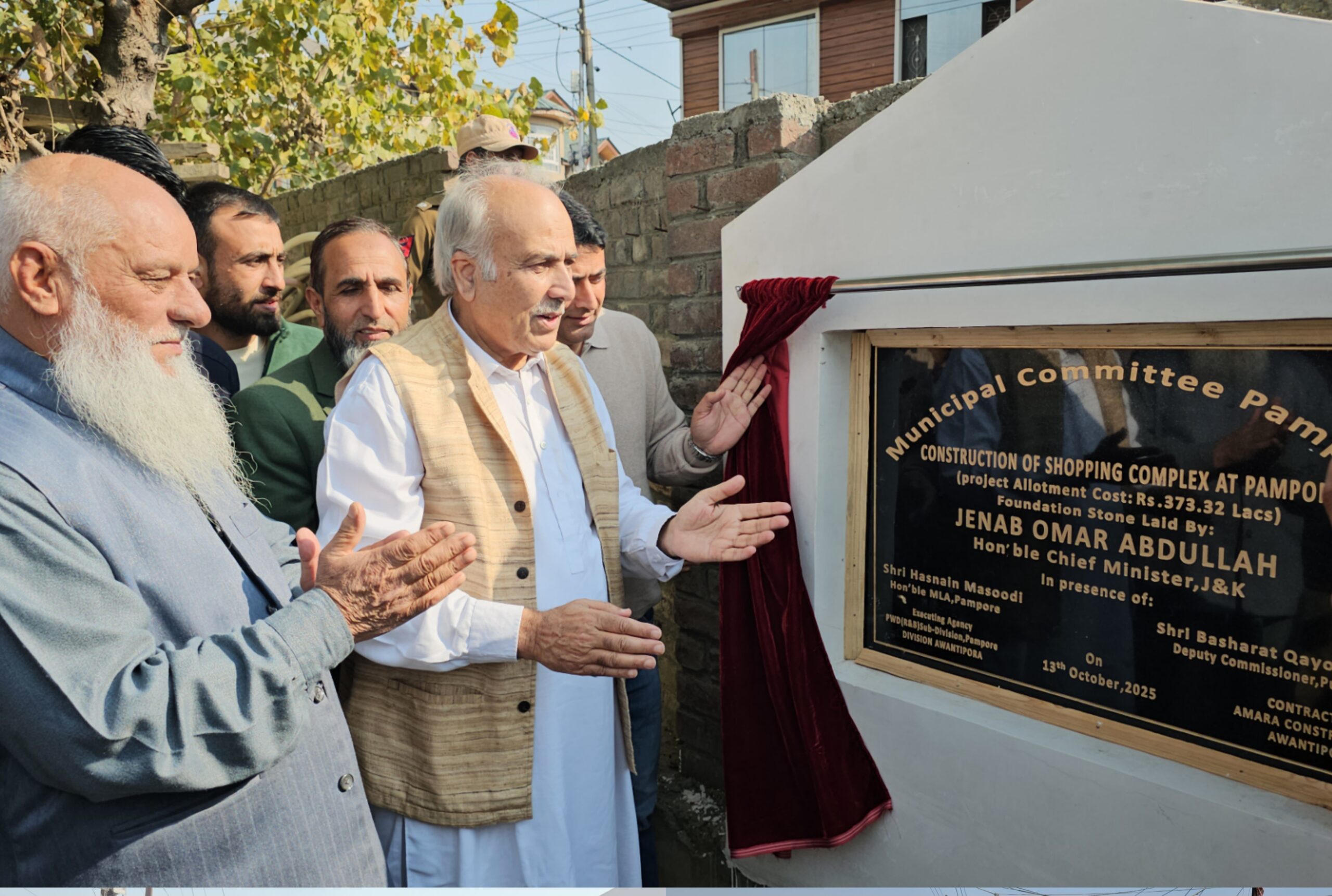 Pampore, October 29: MLA Pampore, Justice Hasnain Masoodi (Retd), laid the foundation stones for two major development projects — the Beautification of Pampore Town and the Construction of a Shopping Complex at Tanchibagh, Pampore.