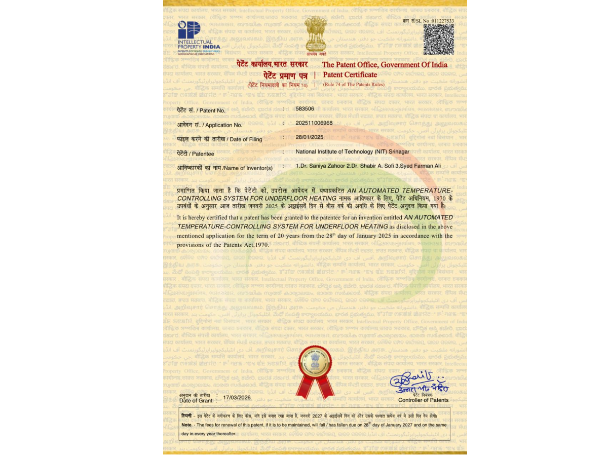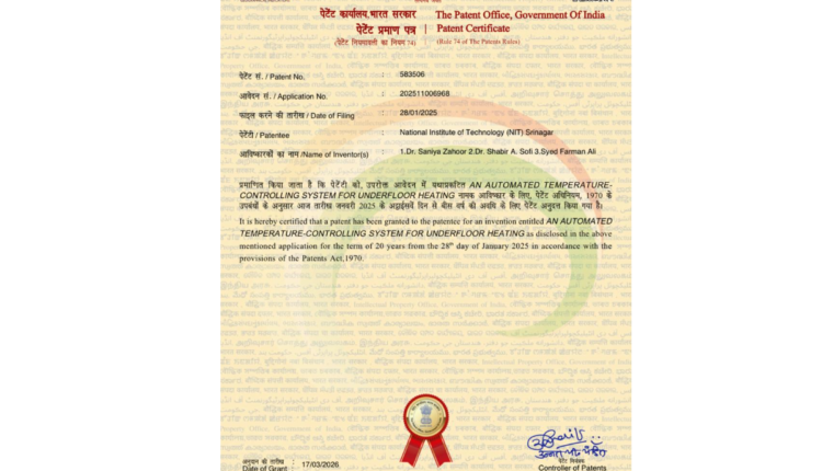 Director NIT Srinagar, Prof. Binod Kumar Kanaujia, said the patent reflects the institute’s commitment to innovation rooted in local needs.