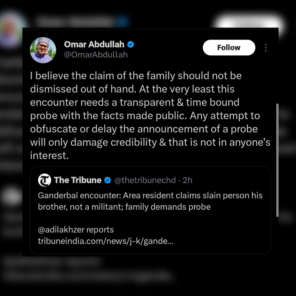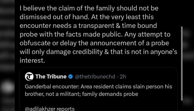 Srinagar, April 2: Jammu and Kashmir Chief Minister Omar Abdullah on Thursday called for a transparent and time-bound probe into a recent encounter in Ganderbal, saying the claims made by the family should not be dismissed without proper investigation.