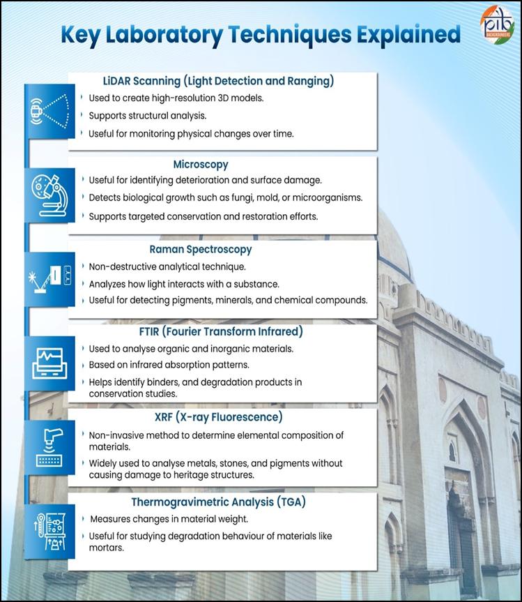 Technology has become an increasingly important pillar in India’s conservation ecosystem, complementing ASI’s traditional practices with tools that improve documentation, diagnostics and long-term preservation. Modern technologies/tools such as LiDAR scanning, GIS based mapping and drone-based surveys etc. are used as per requirement for proper documentation. There has been a growing use of scientific laboratory techniques to study heritage materials, understand patterns of deterioration and determine the most suitable conservation treatments.