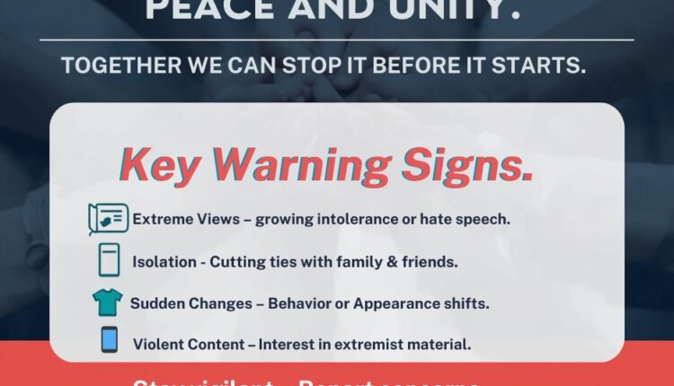 He listed warning signs including the adoption of extreme views characterized by intolerance or hate speech, withdrawal from established social circles, abrupt shifts in personal behavior or ideology, and an excessive preoccupation with violent extremist propaganda.