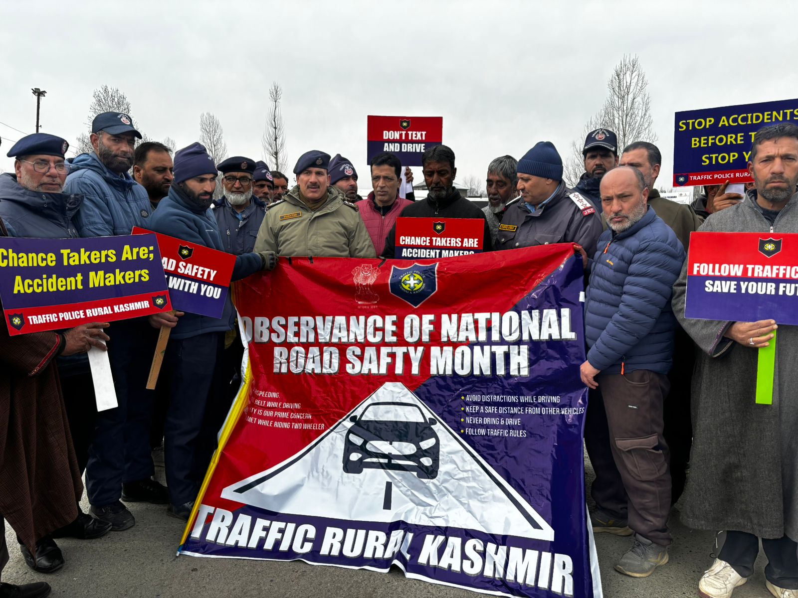 Pulwama, Jan 22: A road safety and traffic awareness programme was organised at Alamdar Sumo Stand, Drusoo in Pulwama district by Traffic Police, Sector Pulwama, under the supervision of the DySP Traffic Pulwama/Shopian Mushtaq Ahmad, along with DTI Pulwama/Shopian Farooq Ahmad and concerned sector officers.