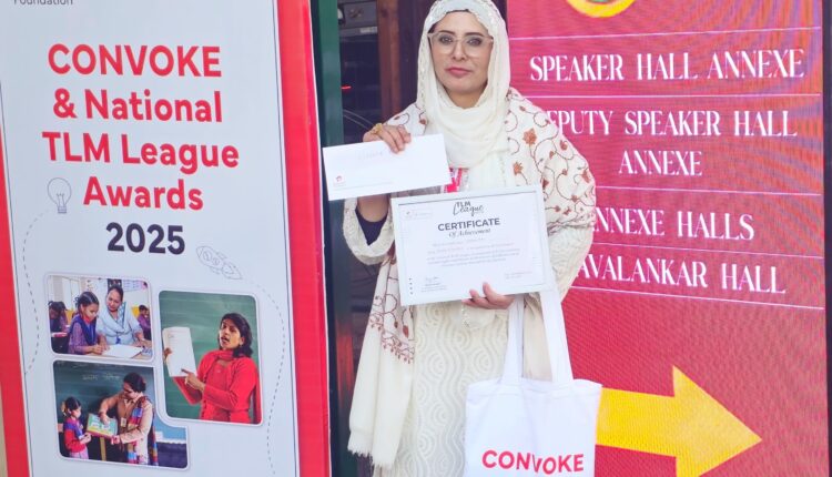 Srinagar, Jan 17 : Sufeena Bano, a multi-award-winning teacher educator from North Kashmir’s Sopore has secured national recognition by earning a place among the Top Ten National TLM Champions at the National TLM League 2025. Her achievement brings honour to the Directorate of School Education, Kashmir (DSEK), and the Union Territory of Jammu and Kashmir.