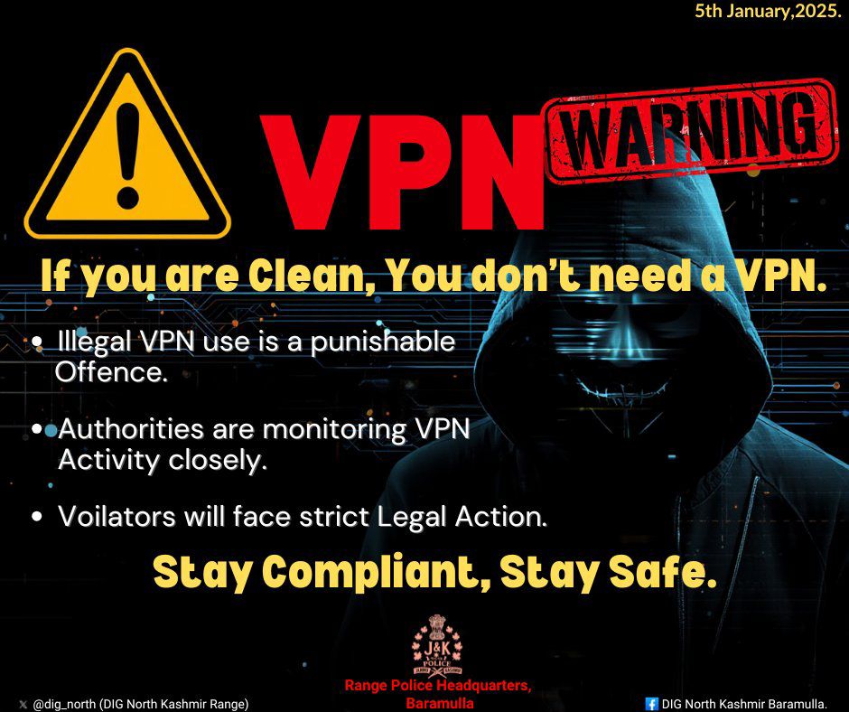 Baramulla, Jan 05:Jammu and Kashmir Police on Monday issued a public advisory cautioning people against the illegal use of Virtual Private Networks (VPNs), stating that such activities are punishable under law.