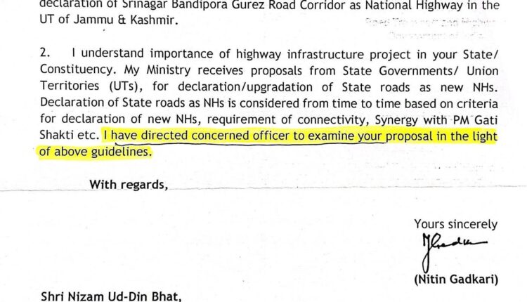 Srinagar, Nov 28: Union Minister for Road Transport and Highways, Nitin Gadkari, has formally responded to former MLA Bandipora Nizamuddin Bhat’s request seeking National Highway (NH) status for the Srinagar–Bandipora–Gurez Road Corridor.