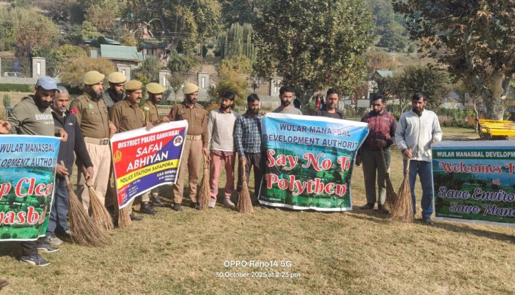 Manasbal(GANDERBAL), OCTOBER 30: The Wullar Manasbal Development Authority (WMDA), in collaboration with the District Police Ganderbal, today conducted a mega sanitation drive around the picturesque Manasbal Lake to promote cleanliness, environmental conservation, and community awareness among people.